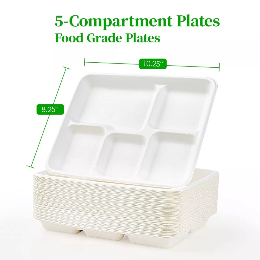 Eco-Friendly 5-Compartment Disposable Plates – 100% Biodegradable Sugarcane Fiber (Bagasse)