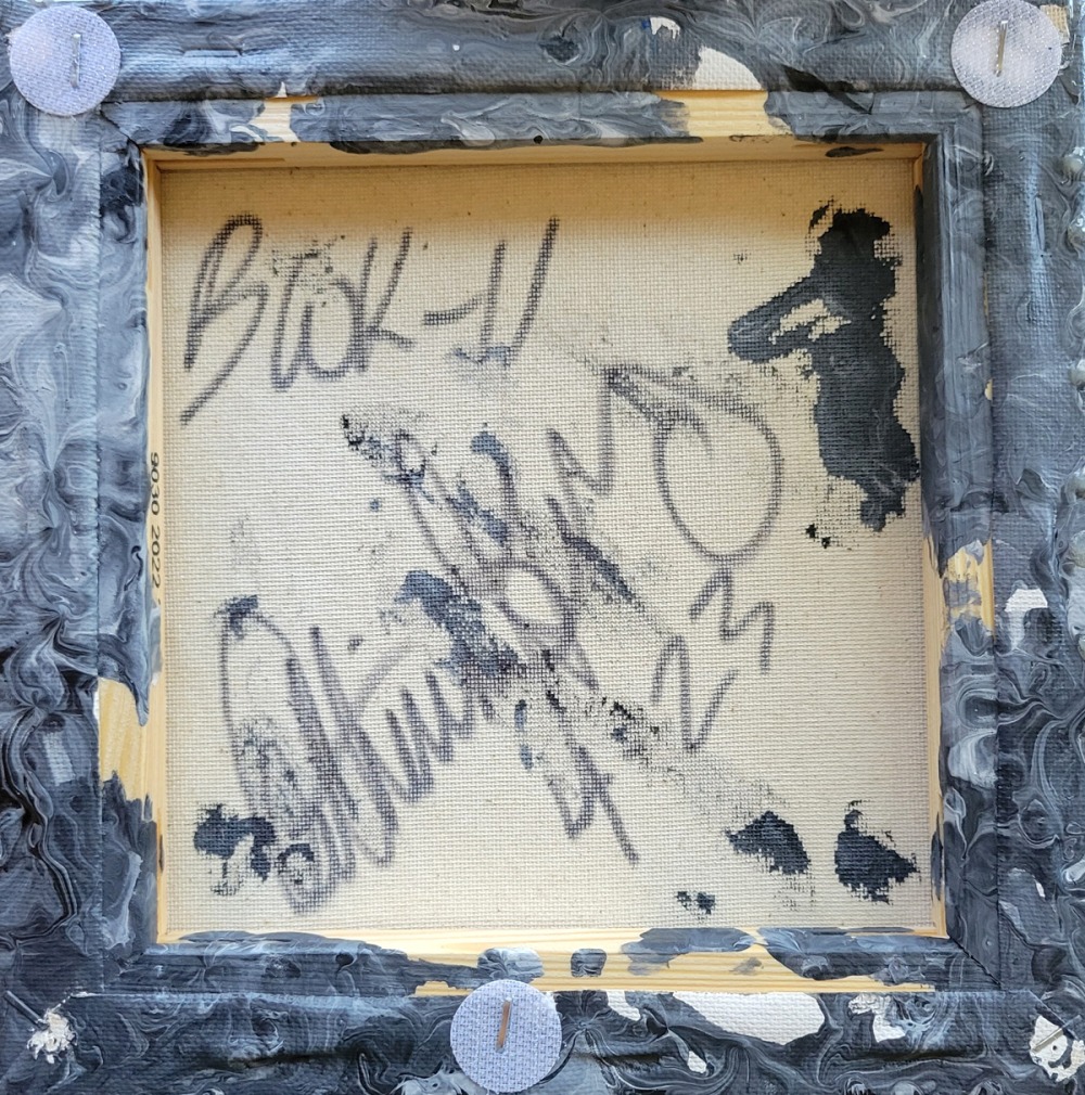 One of a kind original 8×8 inch acrylic painting features a fluid art background features a hand painted black & white kitty. The canvas is stretched on a wooden frame and may be hung as is or framed.