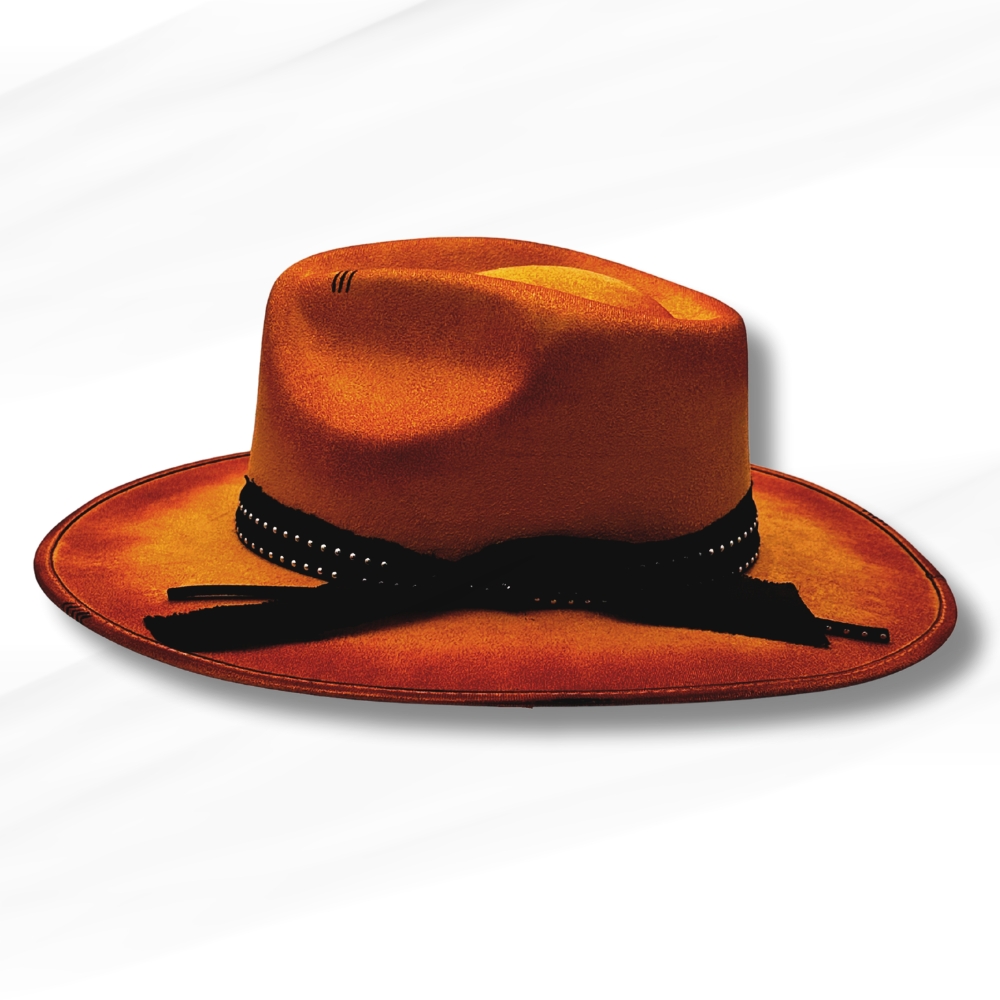 The Burned Crown & Brim Vegan Suede Western Hat is a standout statement piece that blends artisanal craftsmanship with rugged western flair. Handmade in Mexico from premium vegan suede, this hat features a rich burnt-orange base enhanced with hand-burned accents across the crown and along the brim’s edge, giving it a warm, weathered patina.