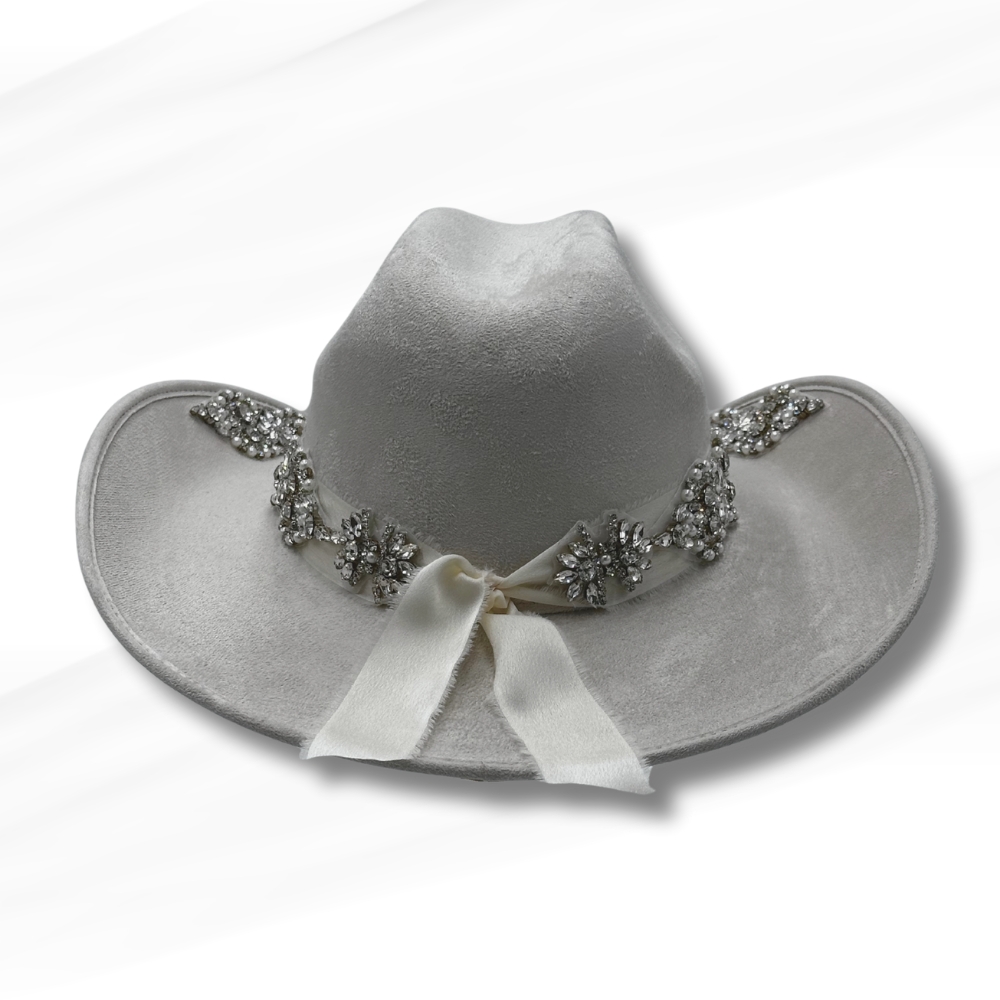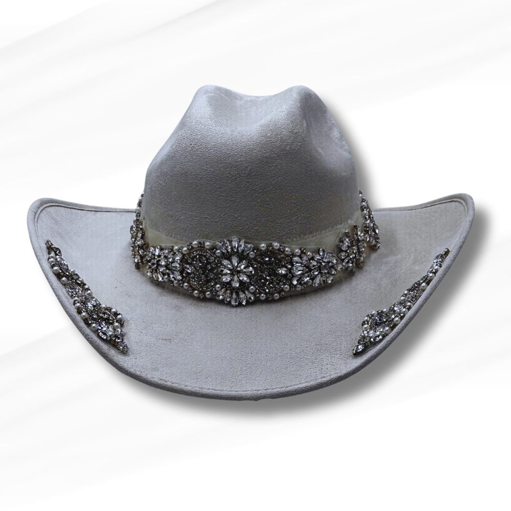 Add a touch of sparkle to your special day with our Luxury Rhinestone & Pearl Bridal Cowgirl Hat — a stunning blend of western charm and bridal sophistication. This exquisite piece begins with a premium vegan suede base, expertly handcrafted in Mexico, then meticulously decorated in the USA with shimmering rhinestones and lustrous pearls.
