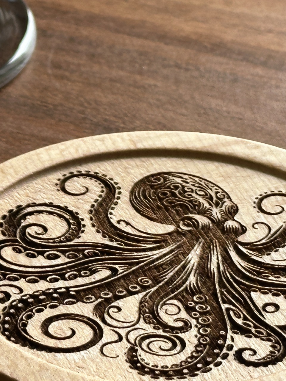 Each coaster is made from high-quality wood, ensuring durability and a beautiful natural finish. The detailed engraving showcases the octopus in all its glory, with every tentacle and texture captured perfectly. Whether you’re enjoying a hot coffee or a cold drink, this coaster is a stunning conversation piece that brings a bit of the deep sea to your table.