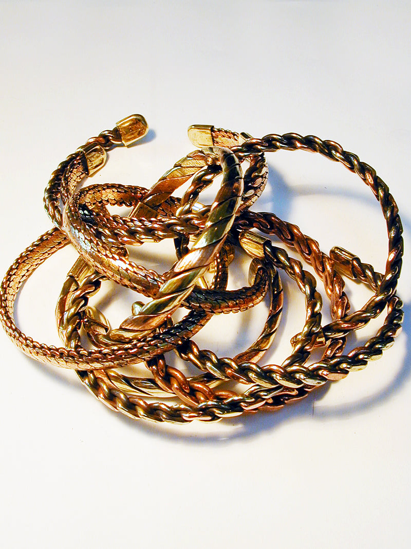 Woven Tri-Metal (copper, silver-brass and golden-brass) bracelet with magnets. Both copper and magnets have been found by many people to help alleviate arthritic aches and pain. This bracelet is easy to adjust to your wrist size and wear comfortably.