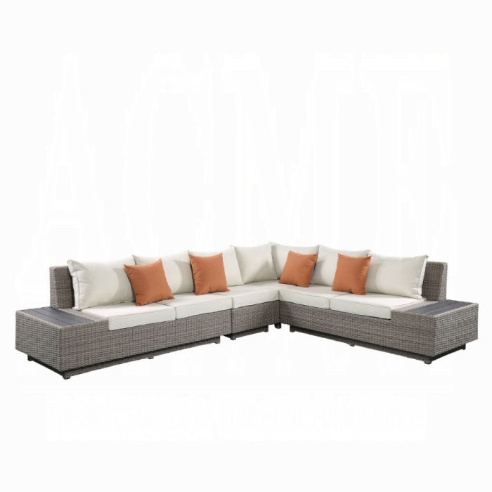 Modern classic styling paired with glamorous elements creates a unique addition to outdoor area in the Salena Collection. Beige fabric features subtle texture with a gray wicker outer body cloth providing visual interest. It comes with accent pillows and side tables that further the transitional styling to complete the look.