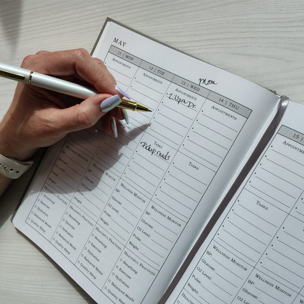 - Dedicated daily logging for vitals (BP, glucose, weight, oxygen level, pulse) and healthful practices (breathing, exercise, hydration, balanced meals, and quality sleep)