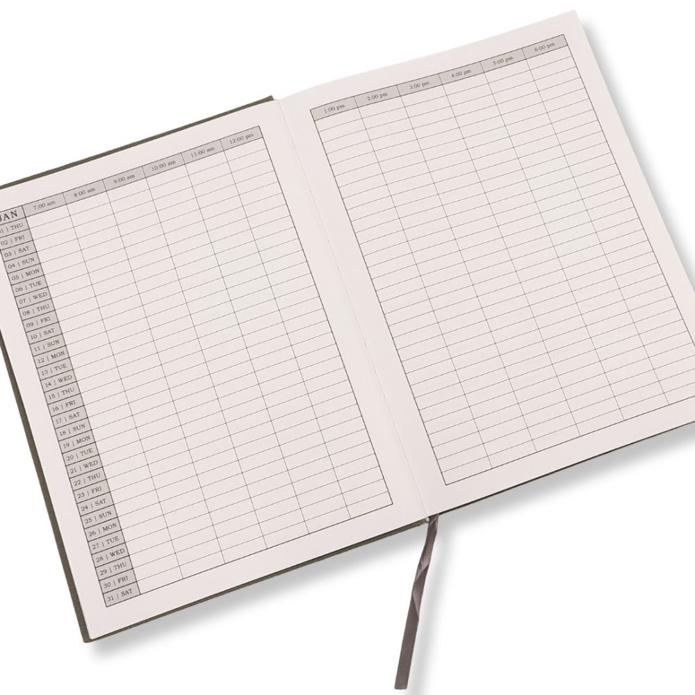 - Features a two-page monthly spread with detailed daily blocks, including designated spots for dates, day of the week, and hourly time stamps for precise scheduling