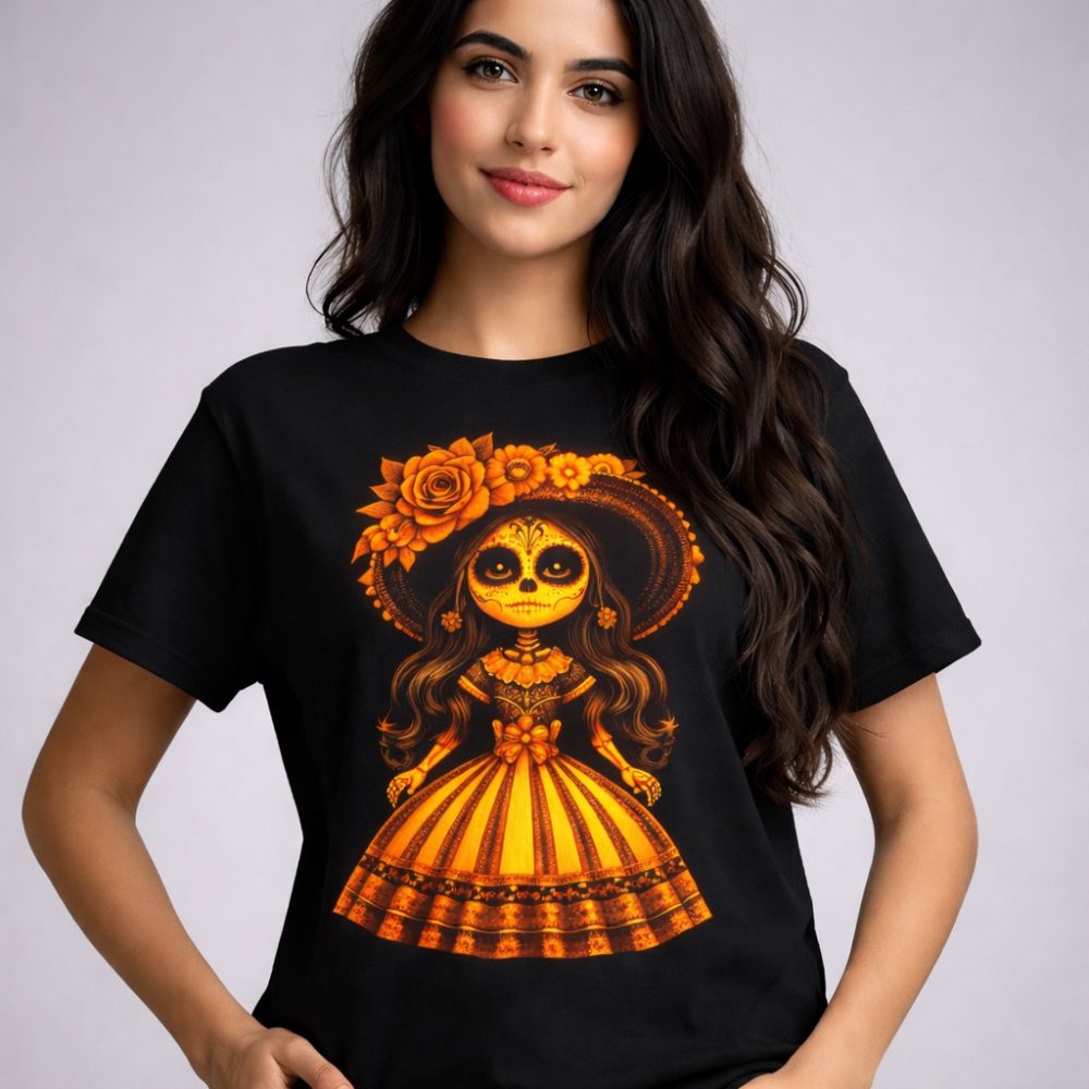 This piece is part of a curated artwear release inspired by La Catrina—reimagined through a contemporary lens and printed in fluorescent orange for bold contrast against deep black fabric. The result is a statement garment that feels more like a gallery piece than a standard tee.