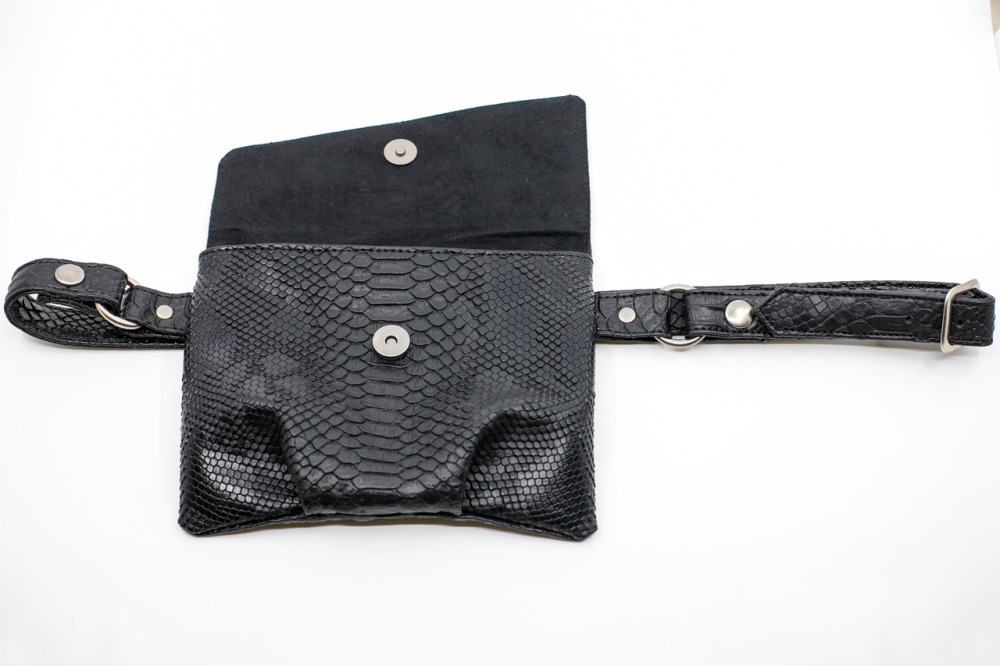 The ultimate hands-free belt bag! Belt bag can be worn as a fanny pack to carry your essentials when you want to be hands-free. Belt bag can be looped through pants or worn over a dress or skirt – it does not create a huge bulge like many other fanny packs. Bag is sleek and soft, and hugs the body just right. Super flirty fringe gives a boho hip look. Black belt bag pouch made out of high quality Italian leather; belt is also high quality Italian belting leather. Perfect bag for traveling, Las Vegas, walking the dog, carrying your essentials when shopping or out with your kids at the park, at a festival or concert…really any time you want to live hands-free.