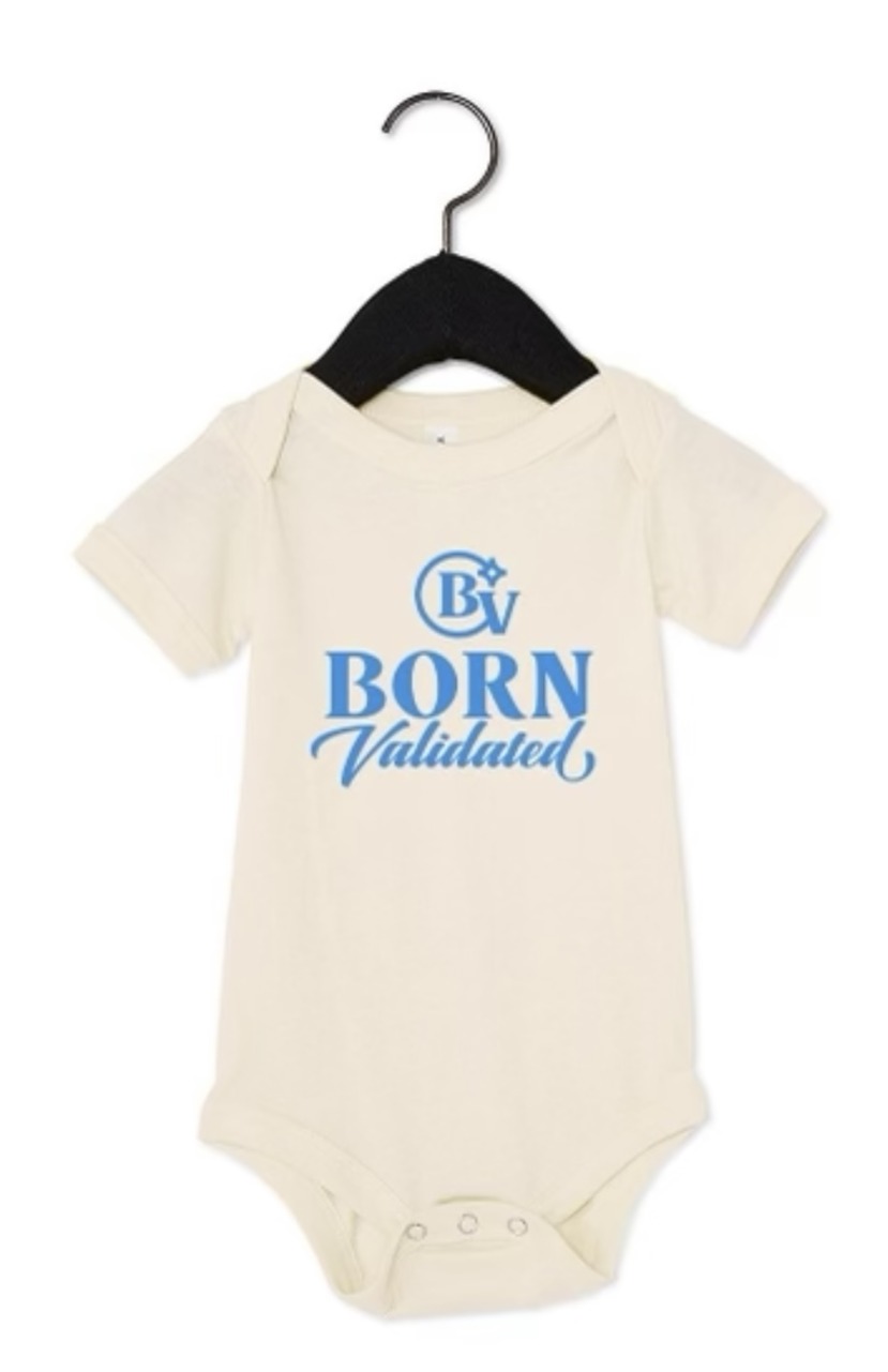 BV onesie cream or black color designed logo in a pastel peach pink or a pastel blue . To adorn your little bundle of joy with a life time of affirmation that they were born validated . Avaiable in sizes 3-6 months,6-12 months ,12-18 months ,18-24 months.