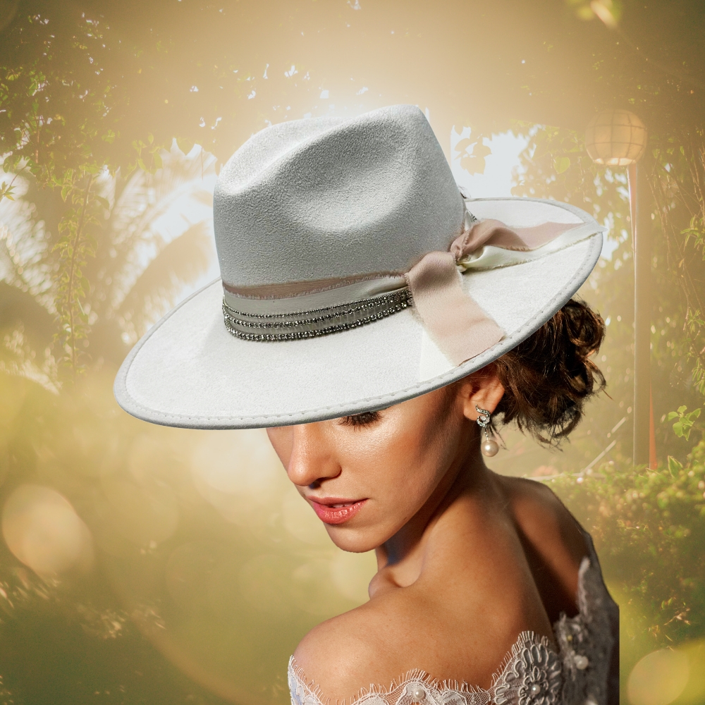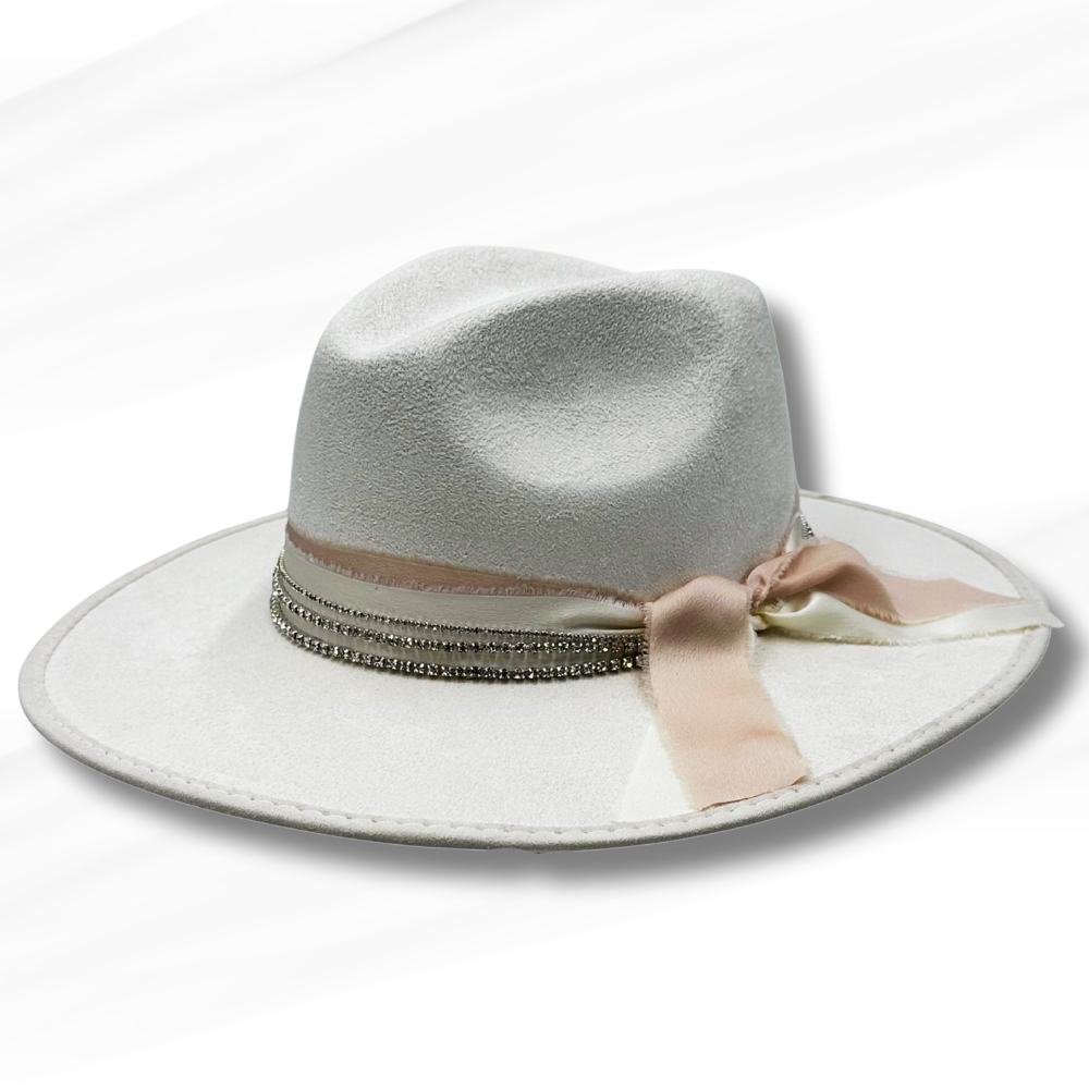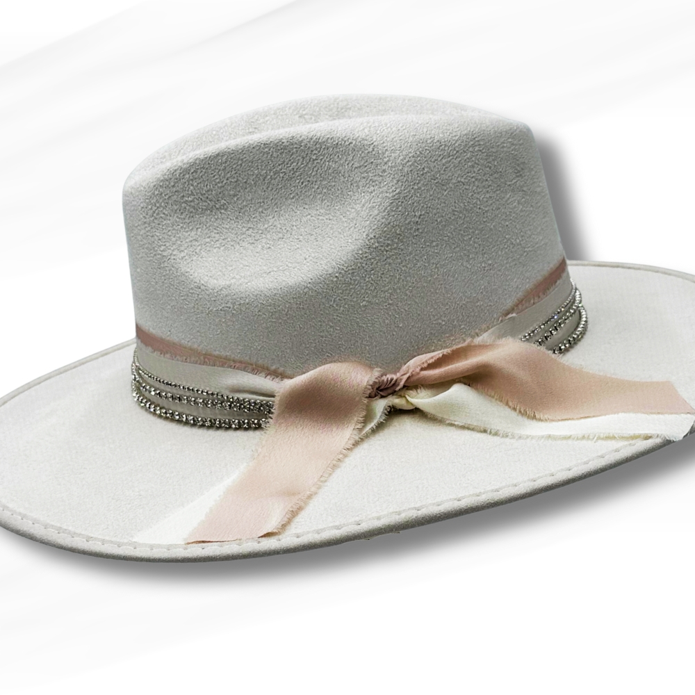 A sparkling rhinestone trim circles the crown, catching the light beautifully, while a soft blush ribbon adds a romantic, feminine touch and ties into a graceful bow at the side. The structured yet lightweight build ensures comfort without sacrificing shape, making it perfect for weddings, special events, festivals, or elevated everyday wear.