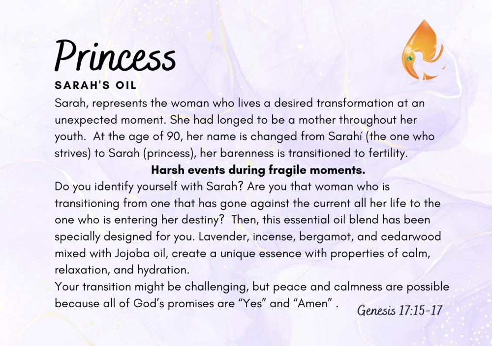 Inspired by the biblical story of Sarah, a woman who waited, persevered, and ultimately experienced God’s miraculous fulfillment, this anointing oil honors every woman standing between “not yet” and “now.” Sarah’s journey—from longing and uncertainty to supernatural promise—reminds us that God’s timing is perfect and His plans bring life, joy, and renewal.
