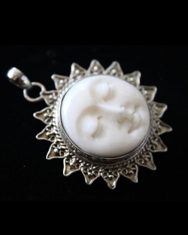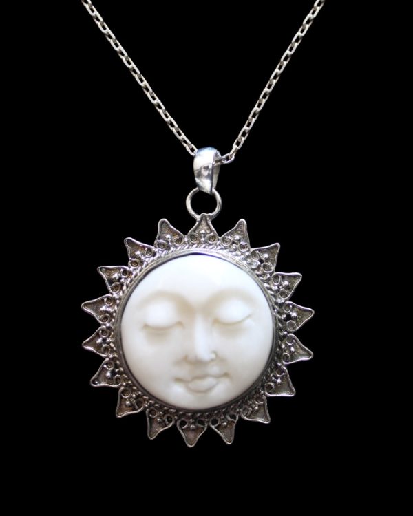 This Balinese inspired pendant showcases a moon eclipsing a radiant silver-toned sun. The sleeping face moon is meticulously hand carved from domestic water buffalo bone. This Balinese pendant is inspired by the rich folklore of Bali and reflects the ancient tale of Kala Rau, the moon-devouring demon, and Dewi Bulan, the moon goddess.
