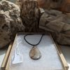 - Custom-made jump ring secures pendant to adjustable length necklace cord with lobster claw clasp: 18-20″