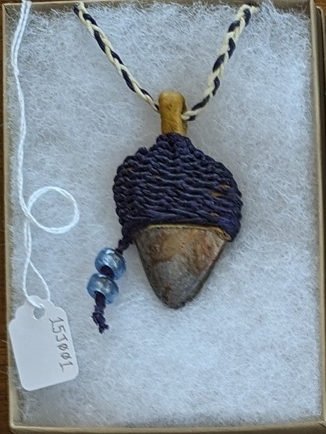 - Two-strand braid expands upward from the decorative end knot to close around the pendant’s formed leather loop.